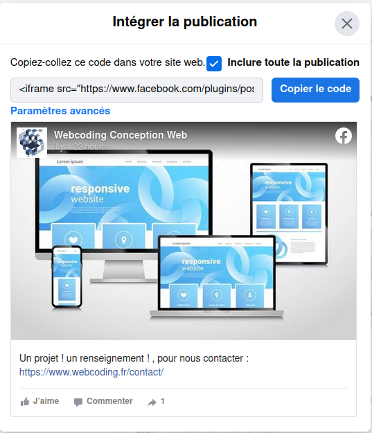 Coller le code copié précédemment dans facebook. Il ne vous reste plus qu’a publier votre article