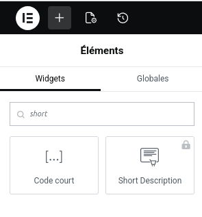 Après avoir cliqué sur le « + » en haut à gauche, rechercher  Short et déplacer l’élément en drag and drop « Code court » dans votre section.