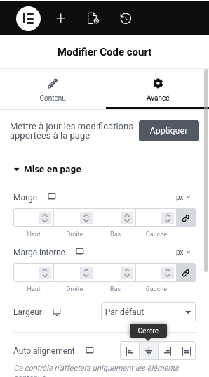 Dans ce cas  cliquer sur « Avancé » puis dans la section « Auto alignement » cliquer sur « Centre » . Noubliez pas de re-publier !